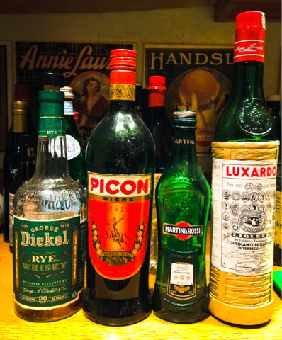 Rye whisky, Picon, Dry Vermouth, Maraschino Liqueur. And a cherry if you please.